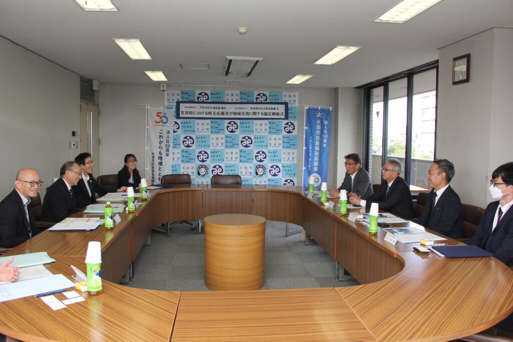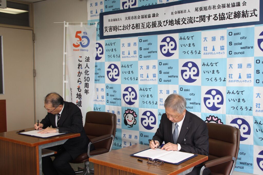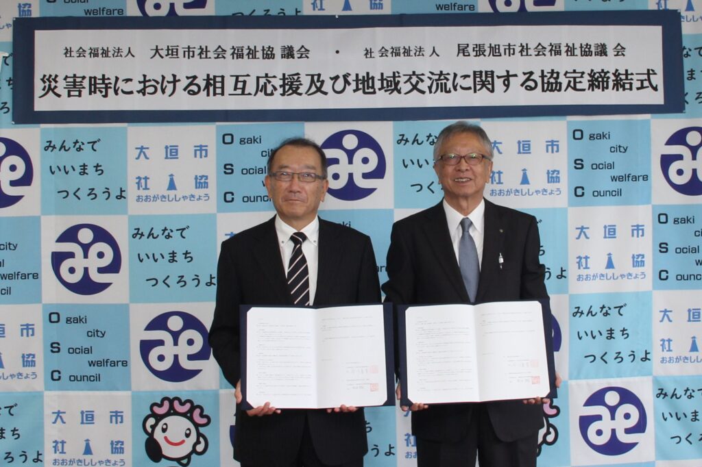 令和7年9月26日(金)、大垣市総合福祉会館の会議室にて、社会福祉法人尾張旭市社会福祉協議会と社会福祉法人大垣市社会福祉協議会による『災害時における相互応援及び地域交流に関する協定締結式』が行われました。