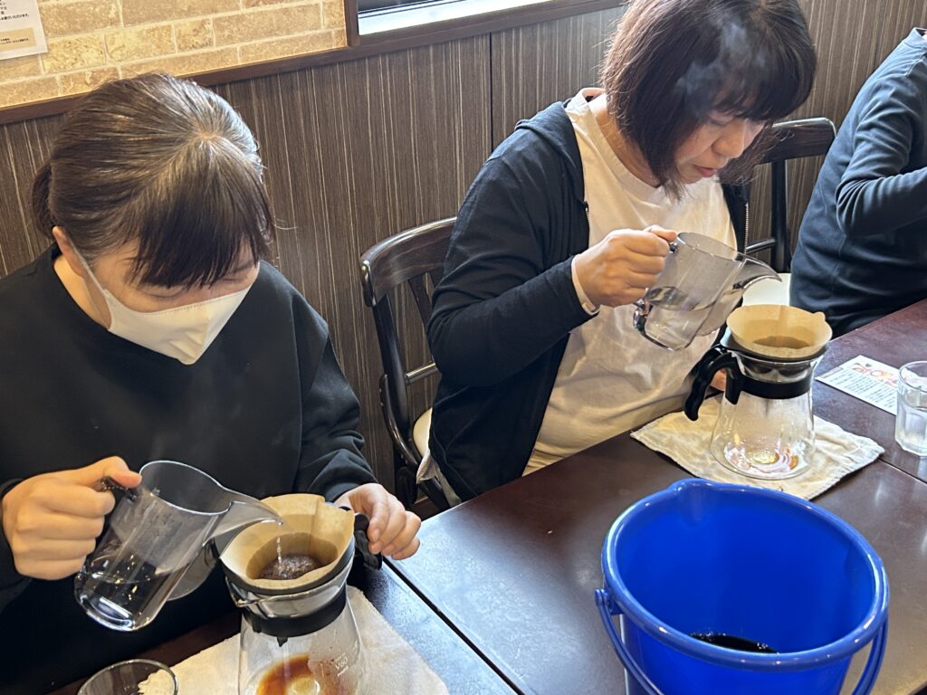 コーヒー豆の量に対してお湯がどれくらい必要なのか、どのように淹れるのか…長﨑屋の淹れ方を丁寧に教えていただきました。「何回に分けてお湯を注ぐといいんですか?」「蒸らすって…どれくらいの時間ですか?」「〇を描くようにお湯を注ぐ方がいいんですか?」「ゆっくり入れる方がいいんですか?」等々、たくさん質問され、一つ一つに丁寧にお答えいただきました。