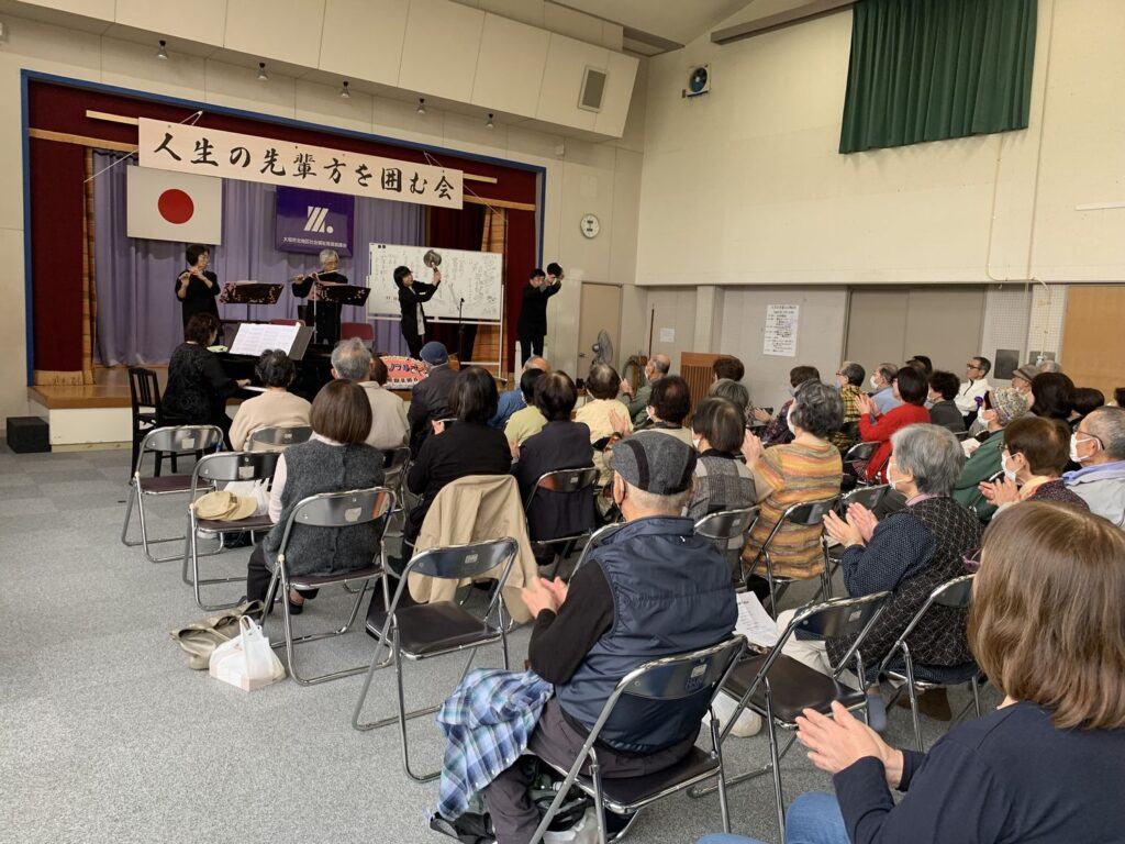 北地区社協(ボランティア部会)主催の事業であり、北地区のおひとり暮らし高齢者にお集まりいただき、楽しい催しをみんなで鑑賞し交流を深めます。会場には100人を超える方にご出席いただきました