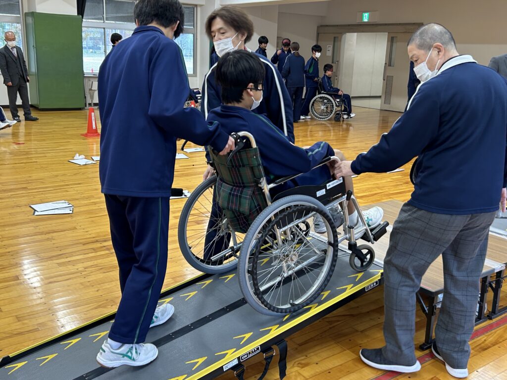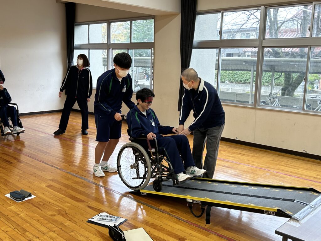 「介護現場からの車椅子の操作方法」を教わりました。介護業務の中で大切にしていることをお話しいただき、車椅子体験としてスロープや段差の昇降、自走体験をしました。目隠しをした人を乗せた介助を行うことで、声かけの大切さを学びました。
