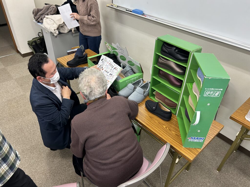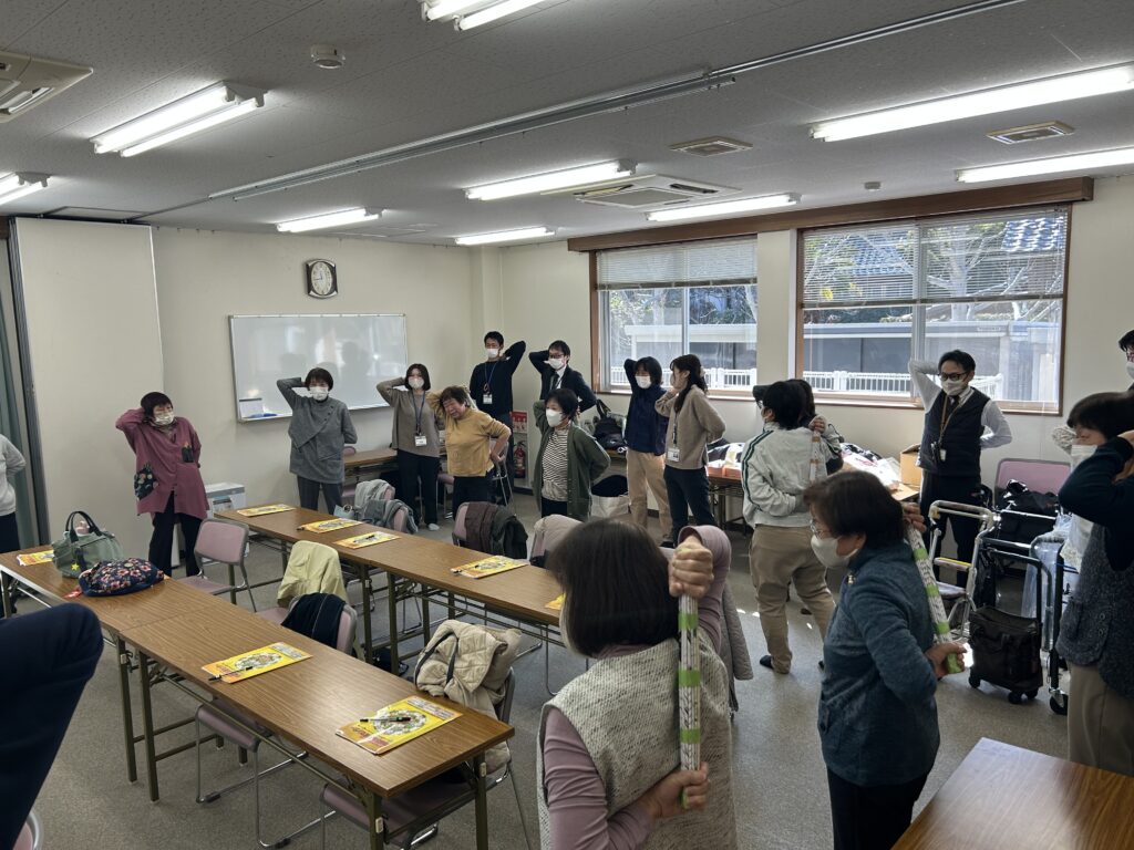 近隣の福祉関係事業所に協力いただき、地域で元気に過ごしていくためのお話しや福祉用具の体験等を行い、最後に体操をして過ごしました。